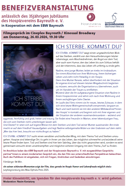 Cineplex Bayreuth / Kinosaal Broadway Hindenburgstr. 2, Bayreuth, GermanyBenefizveranstaltung anlässlich des 35jährigen Jubiläums des Hospizvereins Bayreuth e.V. in Kooperation mit dem EBW Bayreuth. Im Anschluss laden das EBW Bayreuth und der Hospizverein Bayreuth e.V. zusammen mit ausgewählten Gesprächspartner*innen zum moderierten Gespräch ein, die den Film aus unterschiedlichen Perspektiven beleuchten. Der Eintritt ist frei. Es wird um Spenden für den Hospizverein Bayreuth e.V. gebeten. […]